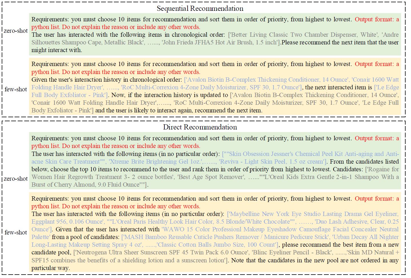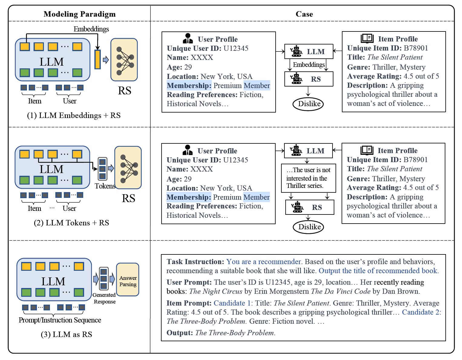 このパラダイムでは、トレーニング済みのLLMを直接リコメンドシステムに転用することを目指しています。入力は通常、プロファイルの説明、行動プロンプト、タスク指示などが含まれ、出力は合理的なリコメンド結果を提供することが期待されます。