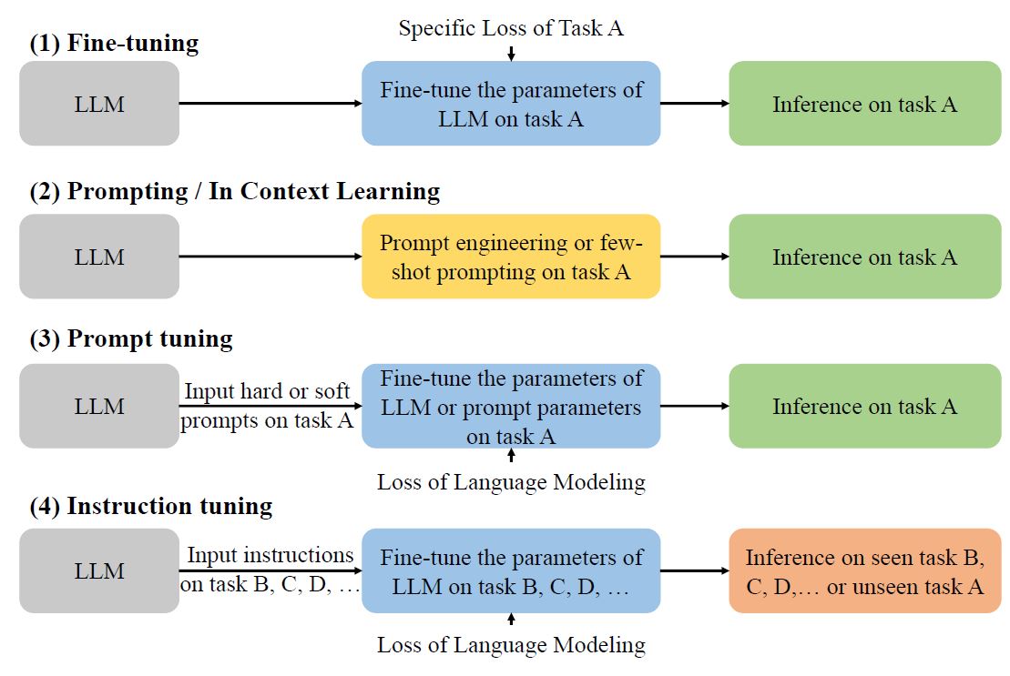 トレーニング方法は、Fine-tuning、Prompting/In Context Learning、Prompt tuning、Instruction tuningに分かれています。それぞれ解説していきます。