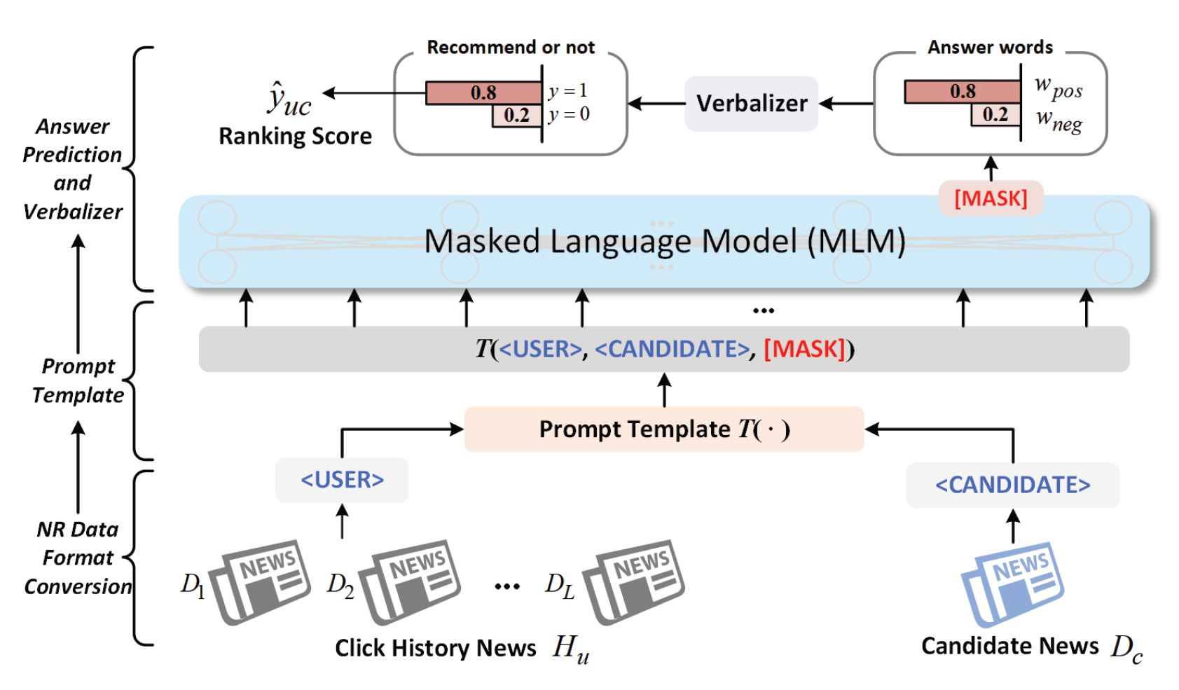 Prompt4NRモデルは、ニュースリコメンド(News Recommendation, NR)のためのフレームワークです。従来のモデルとは異なり、Prompt4NRはプロンプト学習と呼ばれる手法を採用しており、ニュース閲覧履歴(USER)、候補ニュース(CANDIDATE)をプロンプトテンプレートに入力し、ユーザが候補ニュースに対する興味有無(MASK)を推論します。