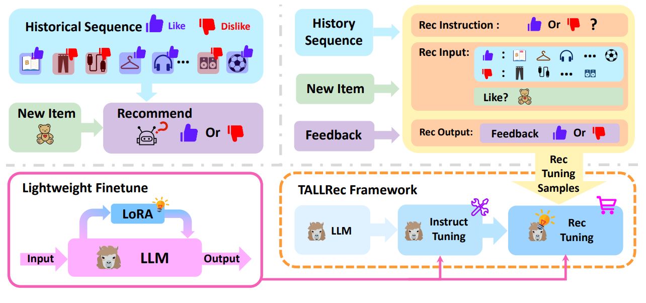 TALLRecは、LLaMAモデルをベースにしており、LoRA(Low-Rank Adaptation)アーキテクチャを利用して効率的なチューニングを行っています。主に、2つのチューニングプロセス、Instruct TuningとRec Tuningを組み合わせています。