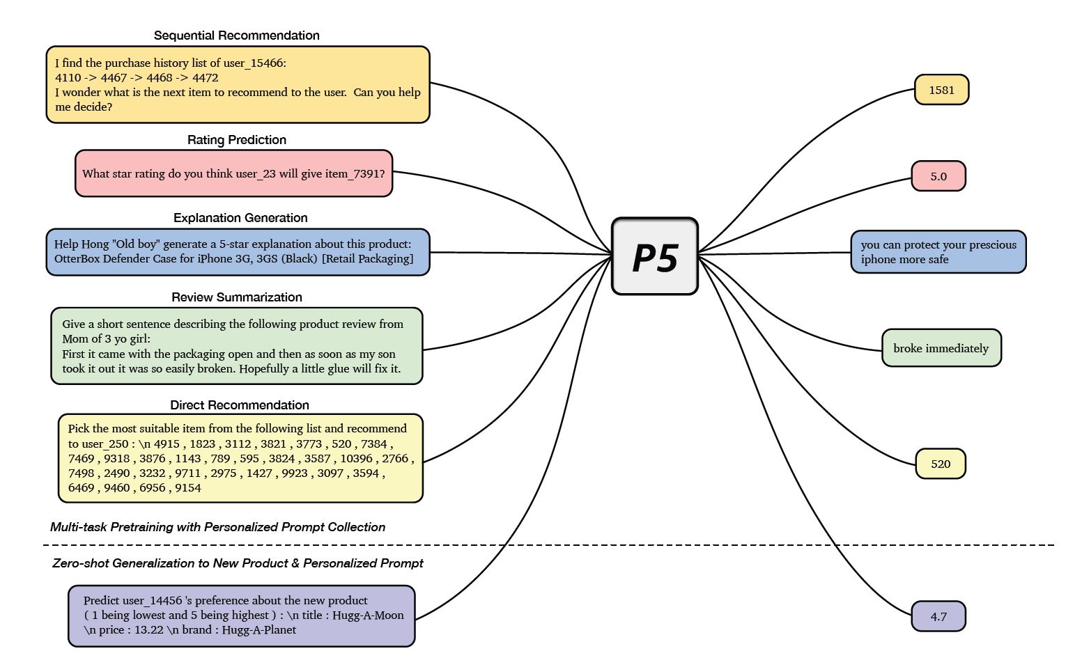 P5モデルは、T5モデルをベースにして、複数のタイプの命令でファインチューニングされたリコメンデーションシステムです。このモデルでは、自然言語処理を応用して、ユーザの行動や好みをより深く理解し、個別化されたリコメンドを行います。P5は、異なるデータソース(ユーザとアイテムの相互作用、メタデータ、レビューなど)を統一的に扱い、言語モデルを通じてこれらの情報を理解します。このアプローチにより、P5はゼロショットやフューショット学習に対応し、広範囲なファインチューニングなしで多様なリコメンデーションタスクに適応できる柔軟性を持ちます。また、プロンプトベースの指示を通じて、より個人に合わせたリコメンドを提供することが可能です。 [Shijie Geng, 2022]