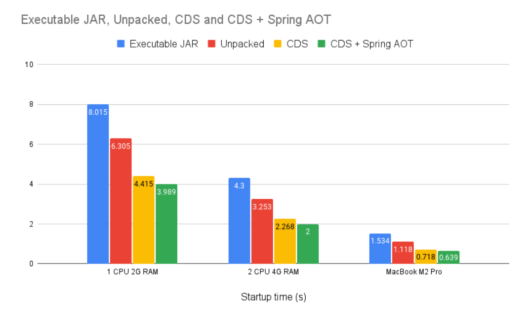 もう一つJavaの起動速度の改善として効果が期待されるのが、「Class Data Sharing(以下CDS)」です。クラスのメタデータをアーカイブファイルにキャッシュし、JVMの起動時にそのキャッシュからクラスを高速に読み込むことで、メモリフットプリントを削減し、起動速度を改善します。Springアプリケーションに対するCDSの効果については、以下記事がVMWareから公開されています。 CDS with Spring Framework 6.1