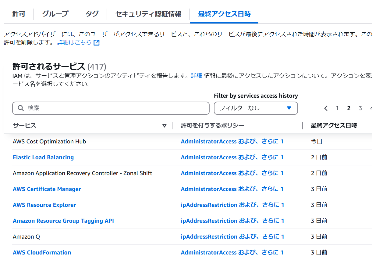 IAMアクセスアドバイザーは、「IAMユーザーやロールに割り当てられたアクセス許可の使用状況」」を確認することができるサービスで、AWS管理コンソール上からは、「IAM」ページの「最終アクセス日時」にて確認可能です。