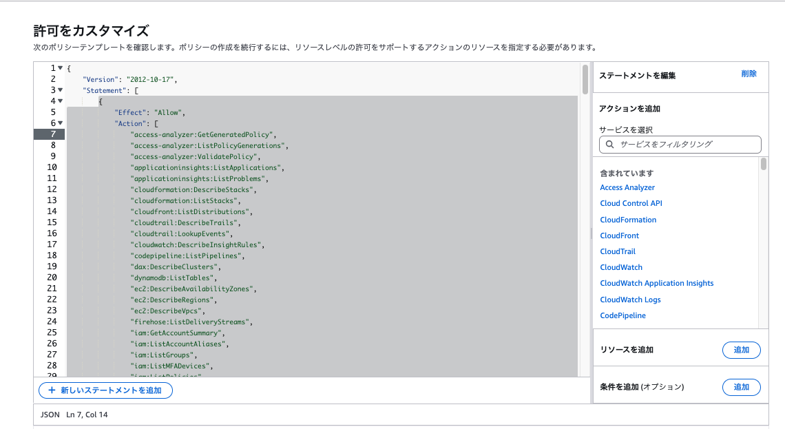 生成されたJSONは以下のようになります。ワイルドカード(*)の記述はなく具体的に必要な権限がピックアップされていそうです。