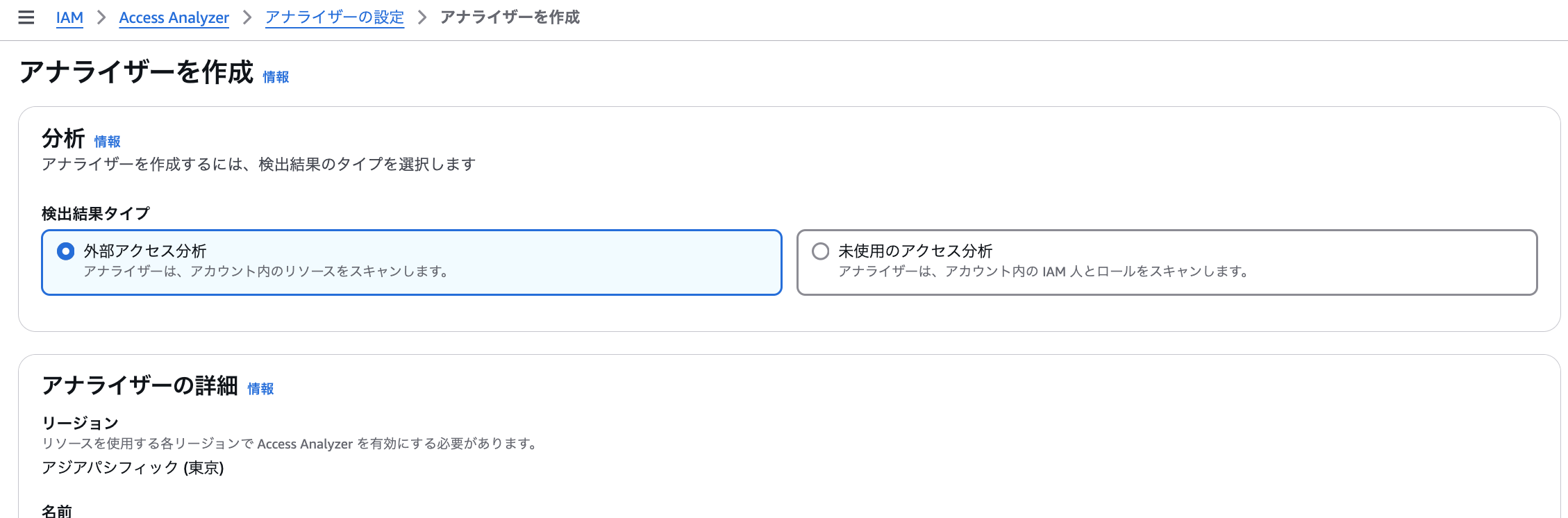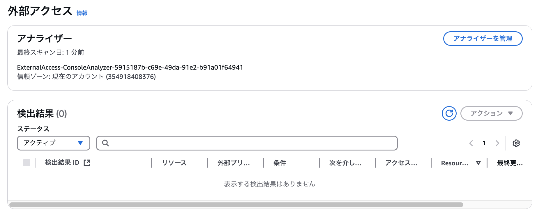 そのため、別のアプローチとして、以下「 IAMアクセスアナライザー」が使用できないかを検討してみました。