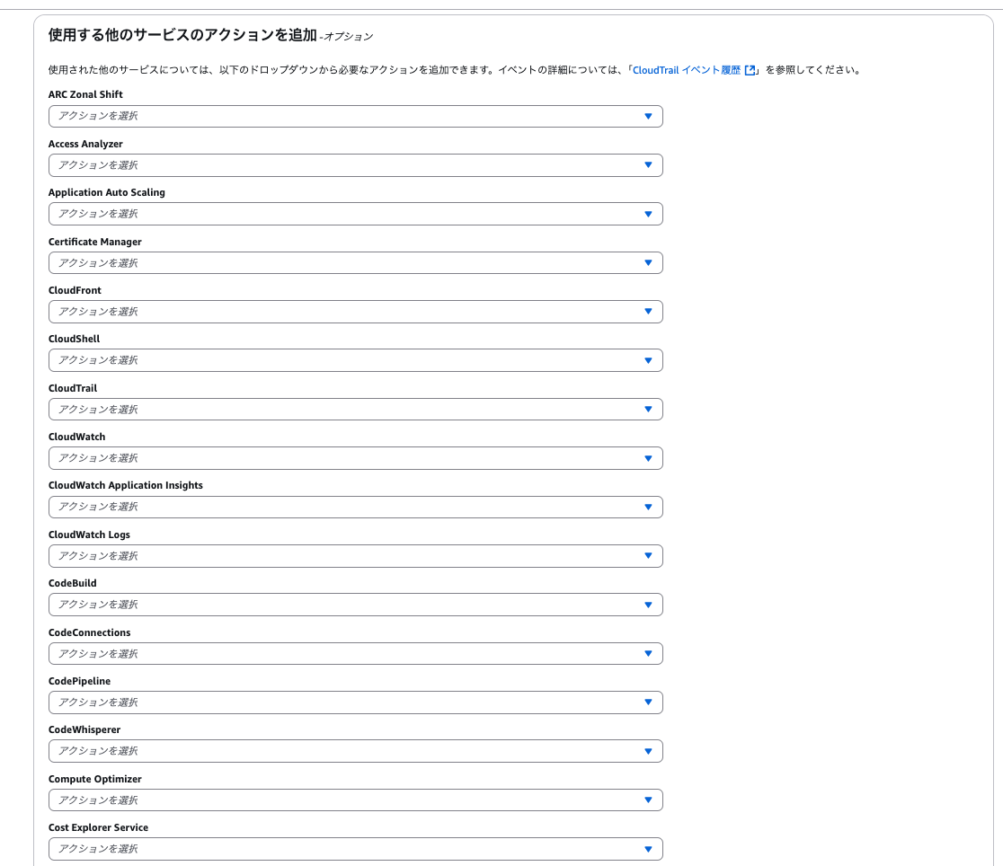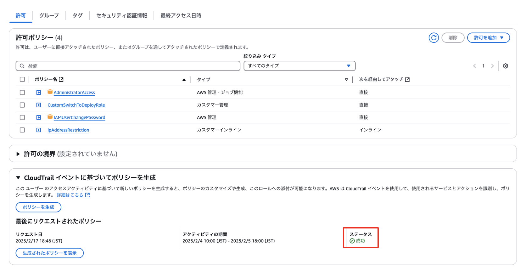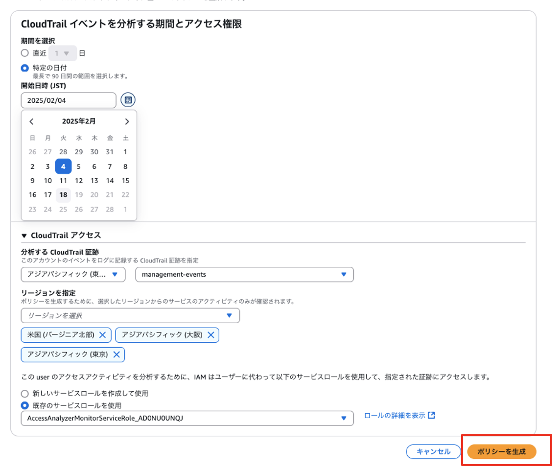 実行後、実行した時間帯を指定して該当のIAMユーザーページより「ポリシーを生成」を実行する。