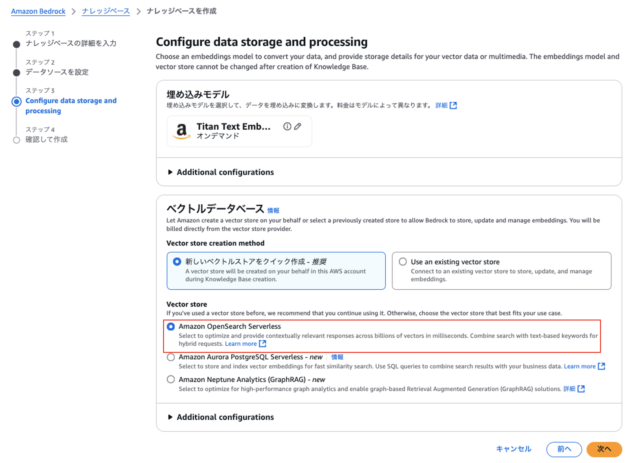 ベクトルデータベースに「OpenSearch Serverless」を選択し、作成します。