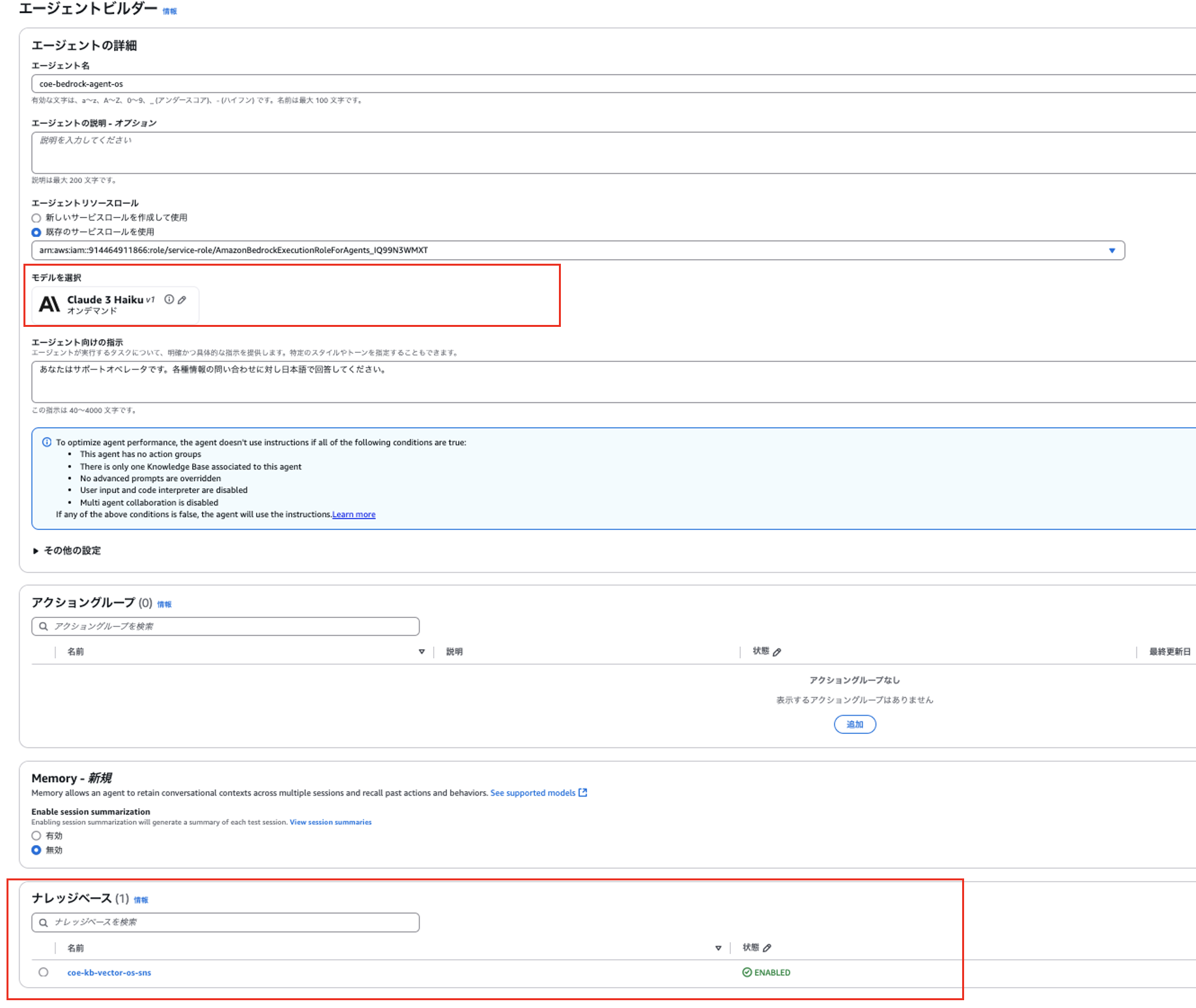 AI基盤モデルと上記で作成したナレッジベースを指定し、エージェントを作成します。