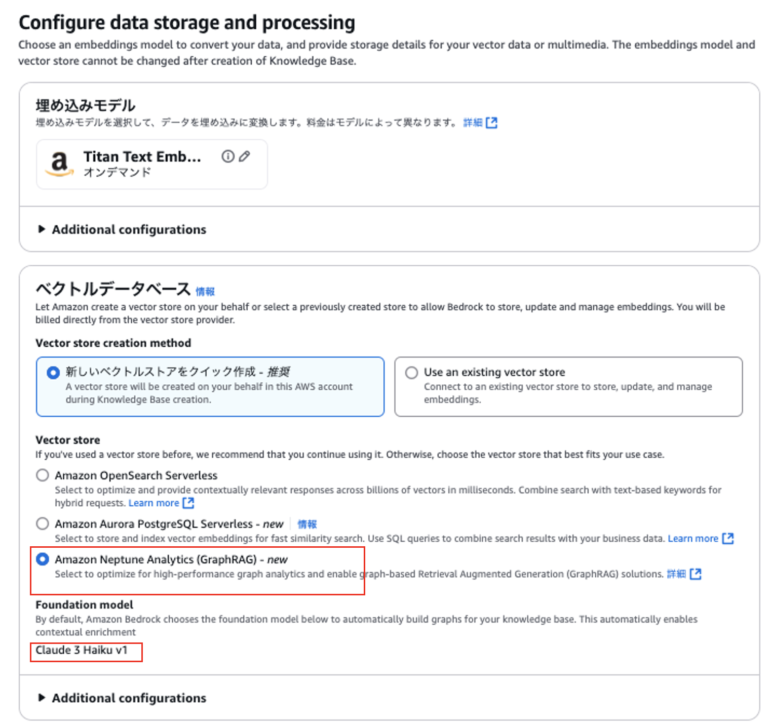 以降の作成手順は、基本的にはベクトル検索RAG側と同じです。GraphRAGの場合は以下のように「Neptune Analytics」を選択します。なお、現在AI基盤モデルは「Anthropic Claude 3 Haiku v1」しか使用できないのため注意してください。