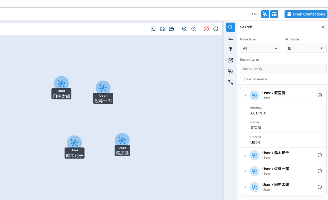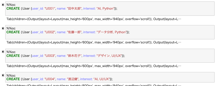 | U001 | 田中太郎 | AI, Python | U002, U004 |