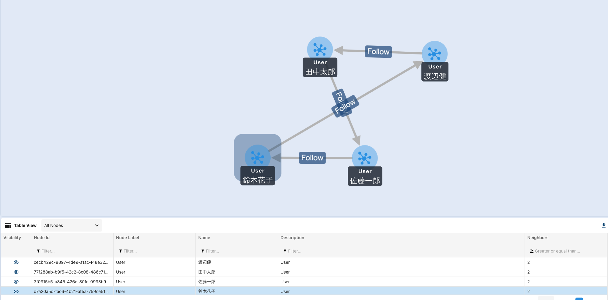 | U004 | フォロー | U001 |
