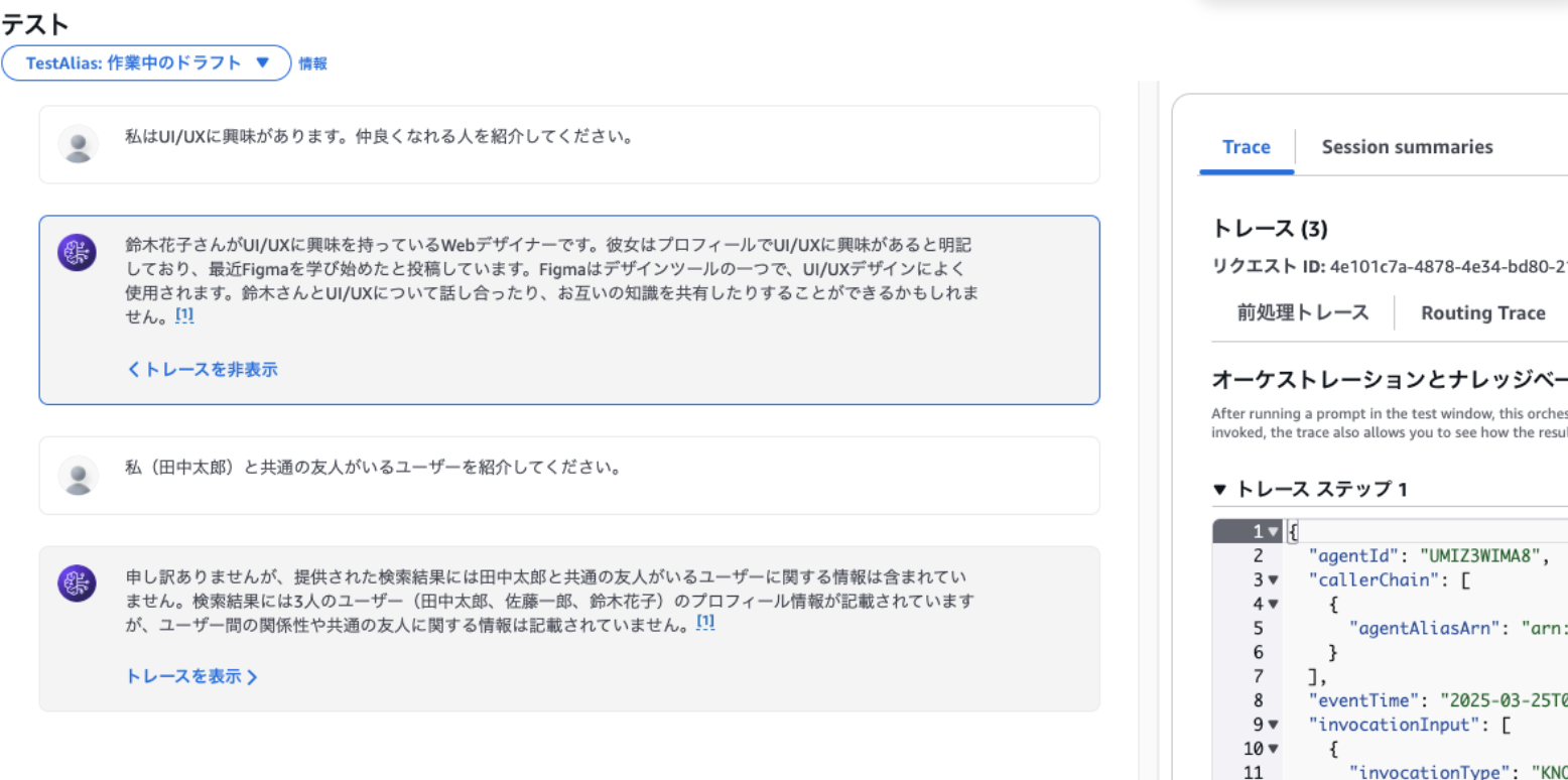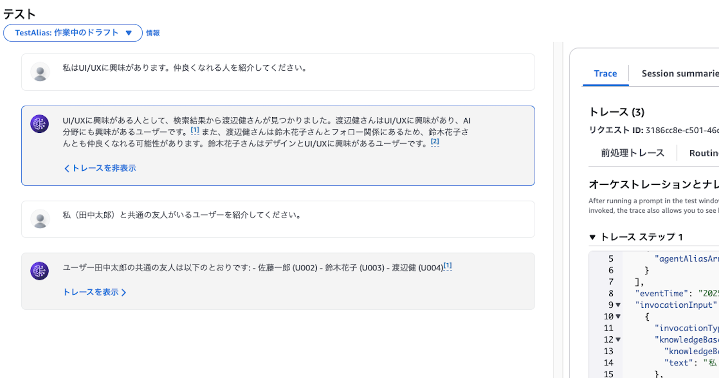 以上、BedrockとナレッジベースでAI エージェントを作成し、実際に外部公開するまで試してみました。説明の関係上、記事は長くなってしまいましたが、この内容自体は数十分で実行できるもので、冒頭でもお話しした通り、AIが非常に身近になってきていることを実感しました。データについても、今回は単純な少量のサンプルだったので、見様見真似で手動でCSVを作成しましたが、既にグラフDBを運用されている環境であれば、データをexportしてS3から同期することで簡単に作成することができます。