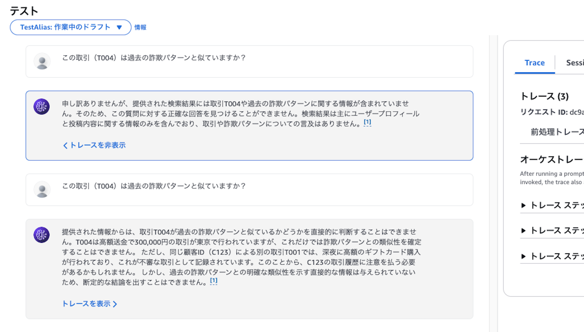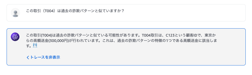 | T003 | C789 | 電子機器購入 | 200000 | 11:00 AM | 大阪 | 以前のパターンと一致 |