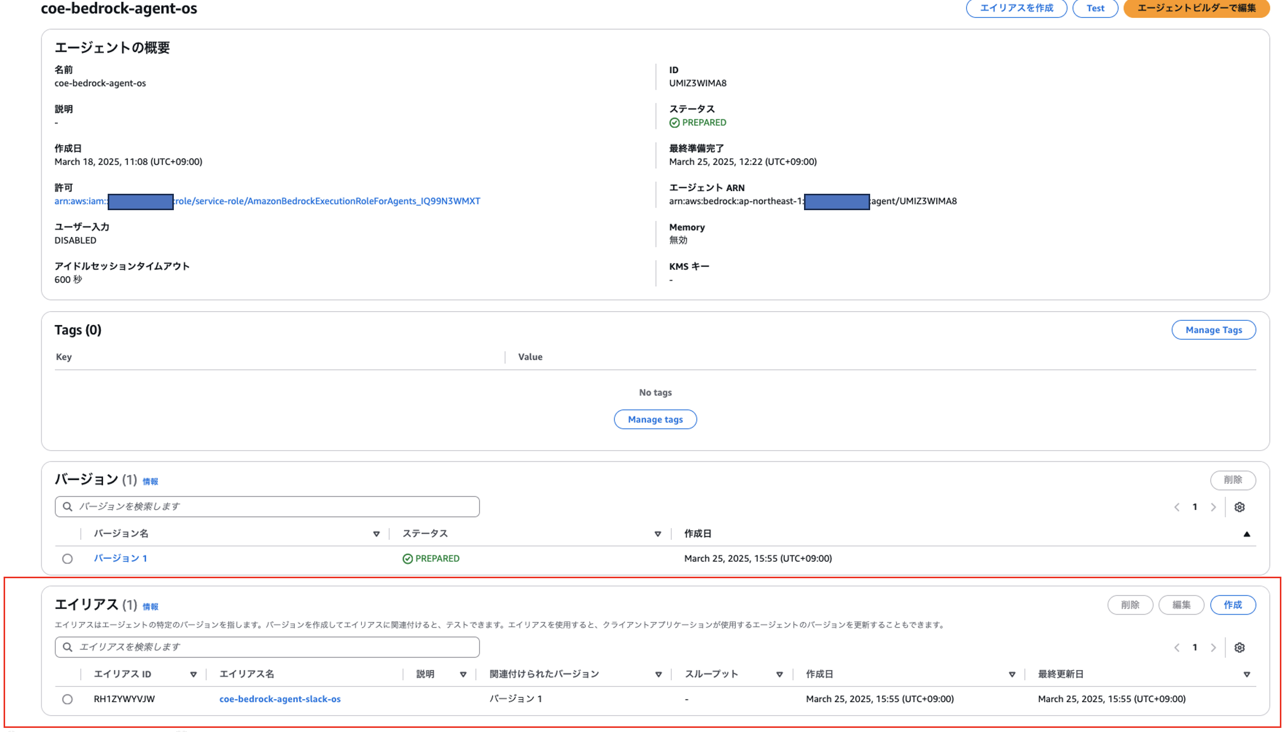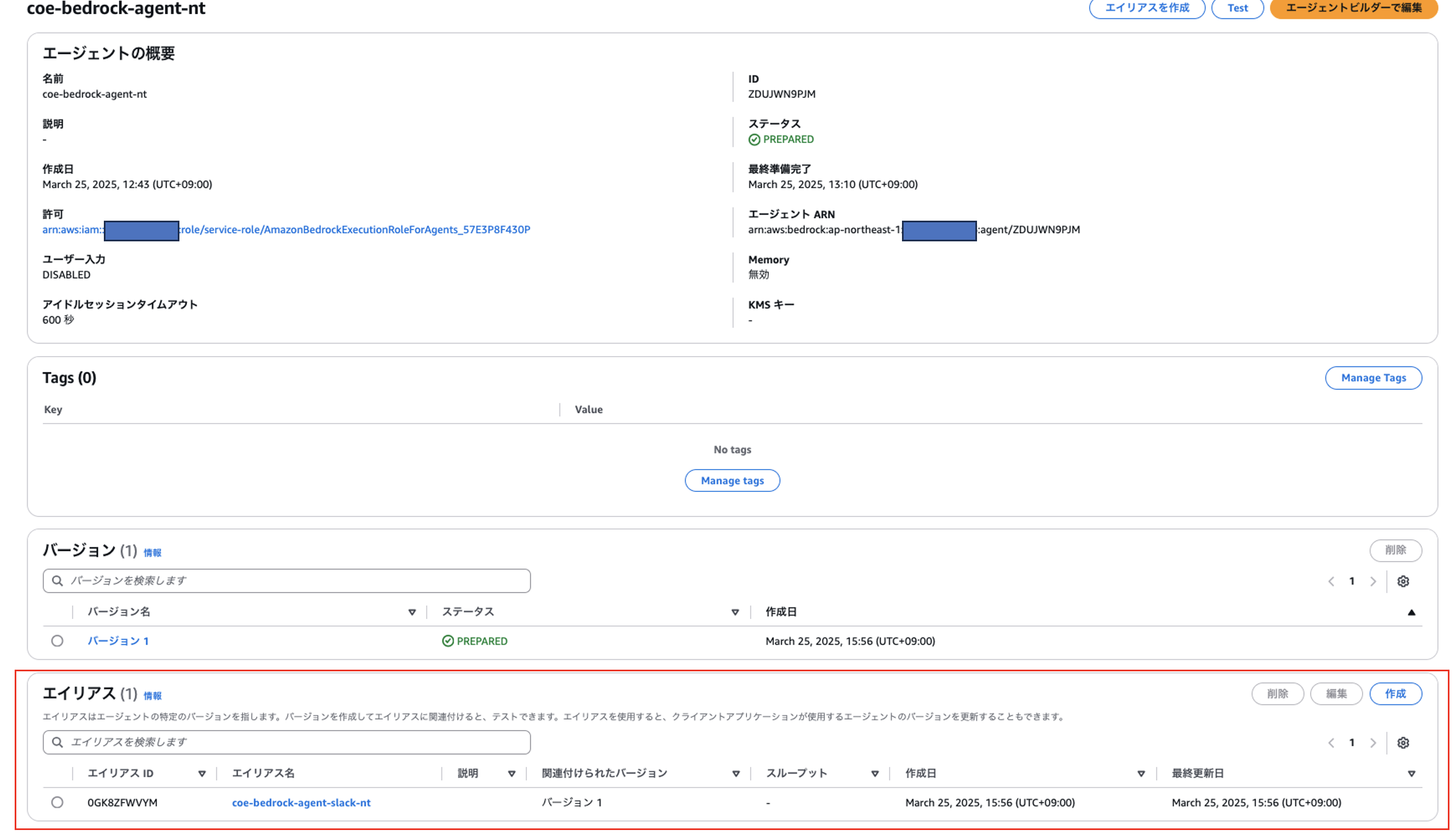 ①Bedrock AIエージェントのエイリアス作成