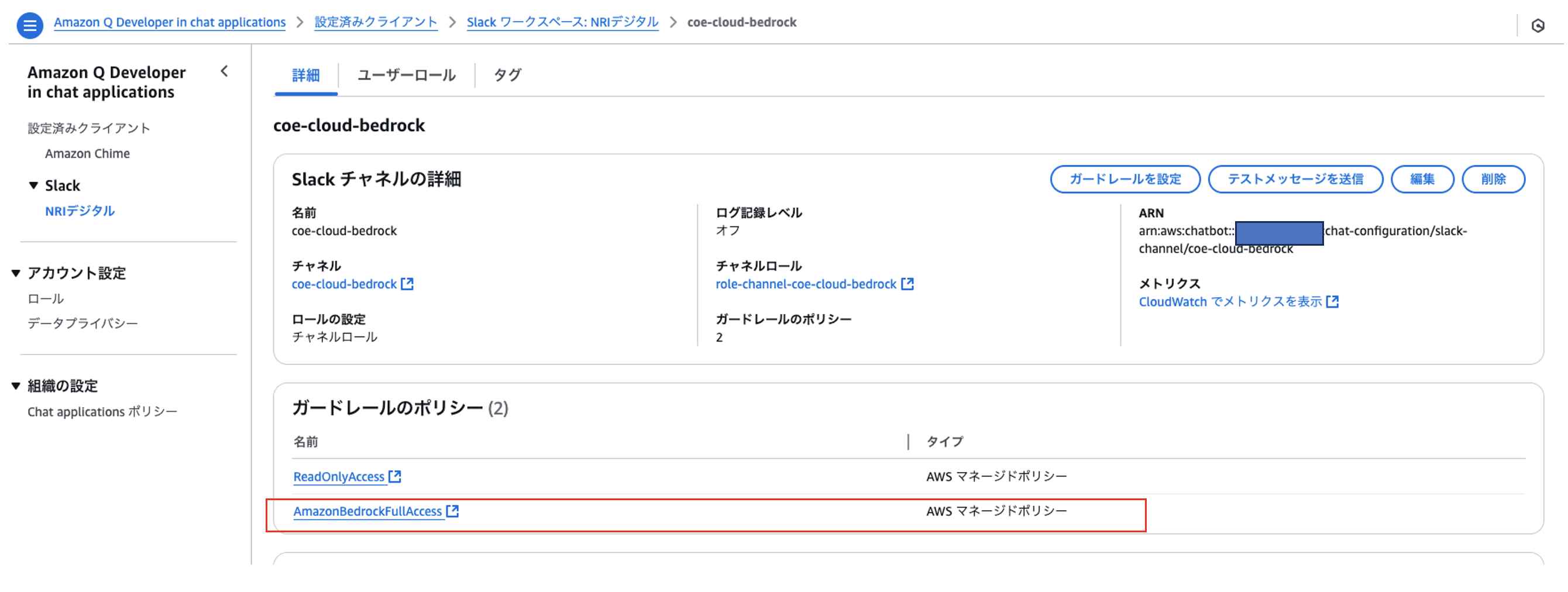 「新しいチャネルを設定」から画面の指示に従い、連携させたいSlackチャネルを設定します。デフォルトだとBedrockのポリシーが足りてないので追加する。