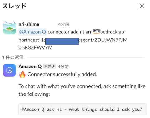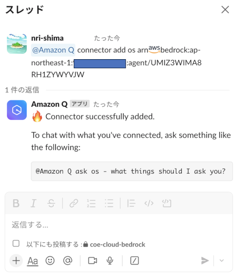@Amazon Q connector add ${コネクター名(※)} ${AIエージェントのARN} ${AIエージェントのエイリアスID}