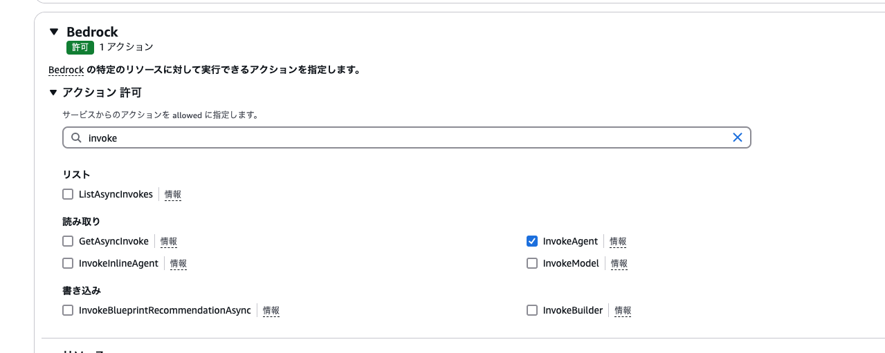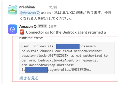 エラーメッセージ通りに「bedrock:InvokeAgent」権限追加することで正常に回答が返ってくるようになりました。