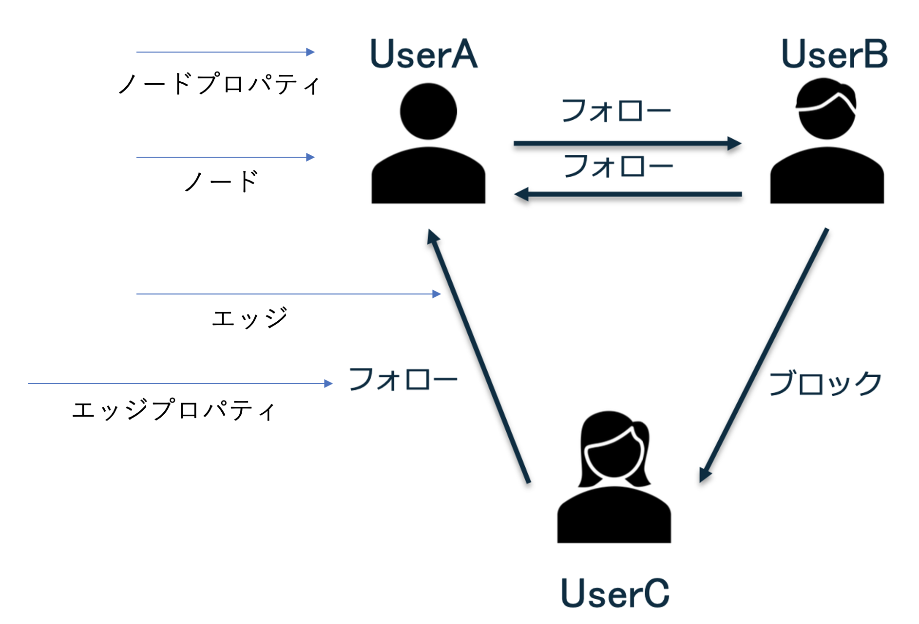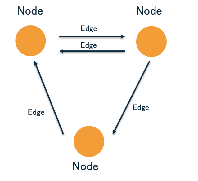 例えば、上記「ソーシャルネットワーク(SNS)」であれば、ユーザーエンティティが「ノード」、ユーザーとの関連リンク(矢印)が「エッジ」、それぞれの属性(ユーザーの「ユーザー名」や関連名(フォローなど))がプロパティとなります。
