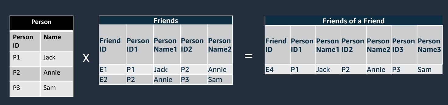 グラフデータベースでは、このイメージままデータモデルとして自然に登録・抽出できますので非常に効率的です。これをリレーショナルデータベース(RDB)で表現しようとすると以下のようになり、JOINのコストが高くなることが想像できます。